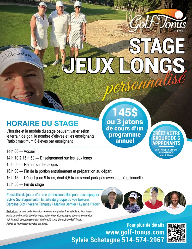 Vous pouvez également former votre propre groupe et choisir l’une des professionnelles alliées de Golf‑Tonus : Caroline Ciot, Valérie Tanguay, Marilou Berner ou Lysane Paquin.