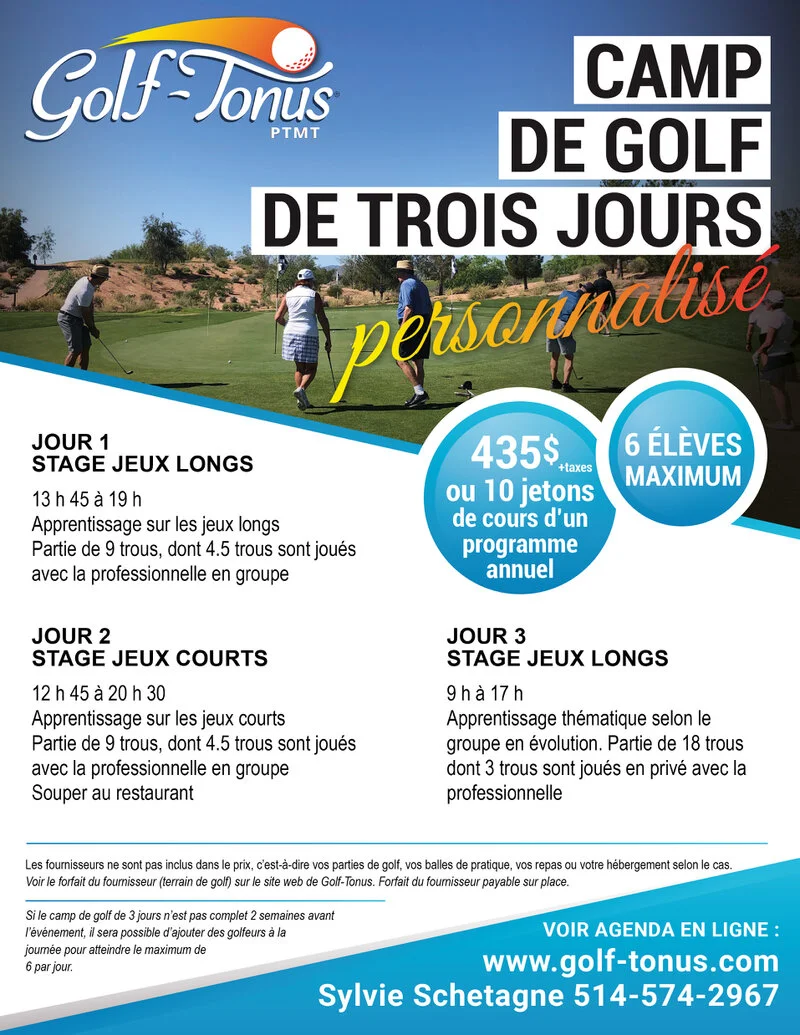 Vous passerez trois journées de qualité avec la professionnelle pour améliorer votre jeu. Ces camps s’adressent à tous les amateurs de golf de tous les niveaux.
